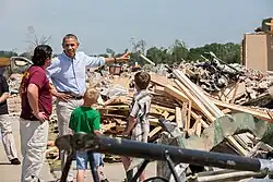 Following the tornado, on April 29, Faulkner County was declared a federal disaster area by President Barack Obama, who was visiting the town of Vilonia to survey the damage and speak with families of the victims. The declaration allowed residents to receive federal aid and low-cost loans to cover uninsured losses.[2] The final rating of the tornado was a source of controversy, with some damage analysts concluding EF5 damage was plausible, and the National Weather Service office in Little Rock said it likely would’ve been rated F5 on the old Fujita scale. It was considered the catalyst for the ongoing EF5 drought as of 2025, sparking discussion within the meteorological community.