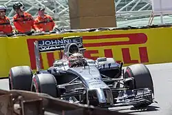 The safety car was deployed to allow marshals to move Pérez's car onto the run-off area.[33] Grosjean's tyre was punctured from contact by Sutil and both drivers made pit stops.[35] Swift work from the marshals allowed the safety car to be withdrawn at the end of the third lap and Rosberg led.[36] A mechanical problem stopped Vettel's turbocharger and the rest of the field overtook him.[23] He made a pit stop and emerged among the leaders and complained he was stuck in first gear.[34] Both Mercedes drivers pulled away from the rest of the field,[37] and Hamilton was six-tenths of a second behind Rosberg by being faster.[36][38] Vettel's turbocharger restarted on lap six but Red Bull instructed him to retire on the following lap.[34][38] The stewards investigated the first lap incident between Pérez and Button.[37] An exhaust issue forced Kvyat to retire in the pit lane on lap 11.[23][37]