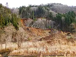 The quake was generated by the movement of the Kamishiro fault. The focal mechanism of which suggested reverse faulting on an eastward-dipping fault extending in the north–south direction. The quake was also had a pressure axis in the west-northwest-east-southeast direction, and is considered to be a shallow earthquake. According to the report of GNSS observations, crustal movements of about 29 cm directing southeast and some subsidence of an estimated 13 cm going the vertical direction were observed at the Hakuba observation point, located in Nagano with the occurrence of the mainshock. In addition, the analysis results from the synthetic aperture radar image according to the Advanced Land Observing Satellite-2 "DAICHI-2", the area of crustal movement spreads across the area of about 30 km east–west and about 30 km north–south centering on the village of Hakuba. In particular, large fluctuations can be seen along the Kamishiro fault to the west of the epicenter of the main earthquake. From these crustal movements, the length of the source fault that caused the slip is estimated to be about 20 km. In at field survey, a surface seismic fault was confirmed in the section of about 9 km from Hakuba Village in Hokujo to Hakuba Village near Kamishiro. In the surrounding areas of Hokujo Shiojima in Hakuba Village located near the west of the epicenter of the mainshock, a surface deformation of the eastern uplift with a vertical displacement of up to about 90 cm was confirmed. The Kamishiro fault, which is part of the Itoigawa-Shizuoka Tectonic Line active fault system, exists near this epicenter area. It is probable that a part of the Kamishiro fault and its northern extension were active in this earthquake.[3][4]