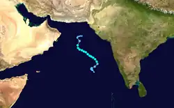 In late October, a low-pressure area formed over the Arabian Sea. It slowly consolidated and a Tropical Cyclone Formation Alert (TCFA) was issued by the Joint Typhoon Warning Center (JTWC) on October 24.[27] The following day, the India Meteorological Department (IMD) classified the storm as a depression, designating it ARB 02, and the JTWC estimated tropical storm winds at the storm's center, starting advisories for the system.[28] On October 26, the system remained stationary and intensified into a Deep Depression. Subsequently, the IMD reported the storm had intensified into a cyclonic storm, and named it Nilofar.[29][30] The following day, the IMD upgraded the storm into a severe cyclonic storm and further to a very severe cyclonic storm, and the JTWC reported hurricane-strength winds at Nilofar's center as it meanwhile developed an eye feature.[31][32][33] On October 28, Nilofar underwent rapid intensification throughout the day, reaching a peak strength of 950 mbar (28.05 inHg) with wind speeds exceeding 205 km/h (127 mph), tied with Hudhud. Over the following days, the storm recurved northeastwards and experienced high vertical wind shear, causing it to weaken rapidly into a minimal cyclonic storm on October 30. The low-level circulation center of the storm became exposed in the following hours and IMD downgraded the storm into a well-marked low-pressure area on October 31, issuing its final advisory for the system.