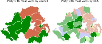 | All eleven councils[21] | DUP (145) | Sinn Féin (115) | DUP (130) | Sinn Féin (105) | 462 | ||||