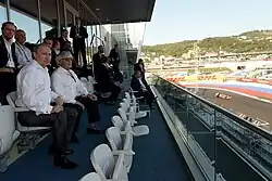 When responding to questions about the race—and humanitarian concerns over the revival of the European Grand Prix in Azerbaijan given Azerbaijan's human rights record—Red Bull Racing team principal Christian Horner refused to offer any kind of judgement, pointing out that it was the responsibility of the FIA to monitor the situation and act accordingly;[16] a position supported by Mercedes director Toto Wolff.[17] Bernie Ecclestone, CEO of the sport's commercial rights holder, publicly stated that he had "no doubts" about the race taking place in the wake of the crash,[18] and distanced the sport from ongoing political debates.[19] With Russia facing increased economic sanctions from the European Union and United States,[20] deputy Prime Minister Dmitry Kozak noted that the Grand Prix would not be affected in the event such sanctions were implemented,[21] and the race went ahead as scheduled. Both Vladimir Putin and Dmitry Kozak were in attendance, with Putin presenting the race winner's trophy.[22][23]