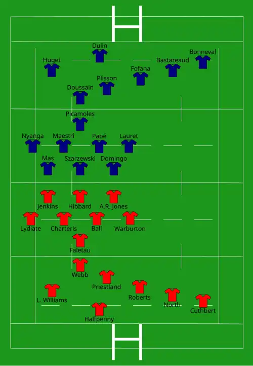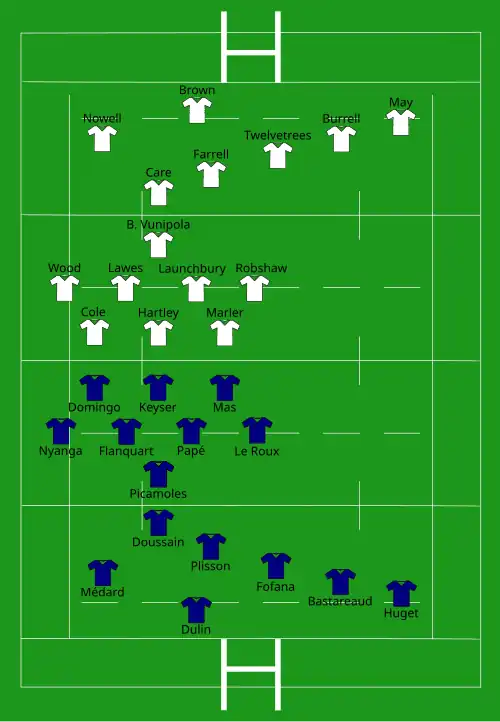 | Try: Huget (2) 1' m, 17' m Fickou 76' c Con: Doussain (0/2) Machenaud (1/1) 78' Pen: Doussain (2/2) 10', 22' Machenaud (1/1) 69' | Report[22] | Try: Brown 36' m Burrell 47' c Con: Farrell (1/2) 48' Pen: Farrell (2/2) 5', 42' Goode (1/1) 72' Drop: Care (1/1) 56' |