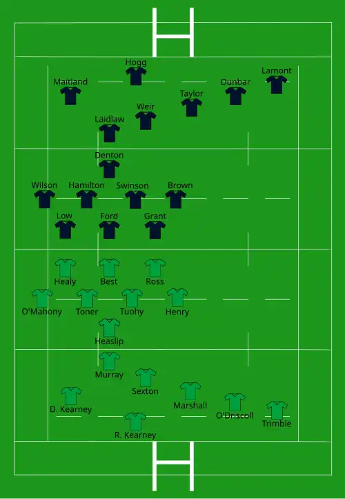 | Try: Trimble 40' m Heaslip 46' c R. Kearney 70' c Con: Sexton (2/3) 47', 72' Pen: Sexton (3/3) 13', 22', 56' | Report[23] | Pen: Laidlaw (2/3) 18', 42' |