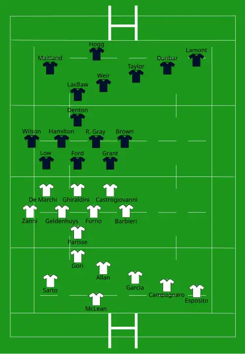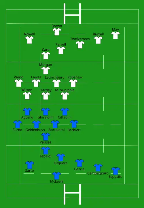 | Try: Cuthbert 3' c S. Williams 37' c Con: Halfpenny (2/2) 4', 39' Pen: Halfpenny (3/4) 28', 66', 73' | Report[20] | Try: Campagnaro (2) 42' m, 68' c Con: Allan (1/2) 69' Pen: Allan (1/2) 13' |
