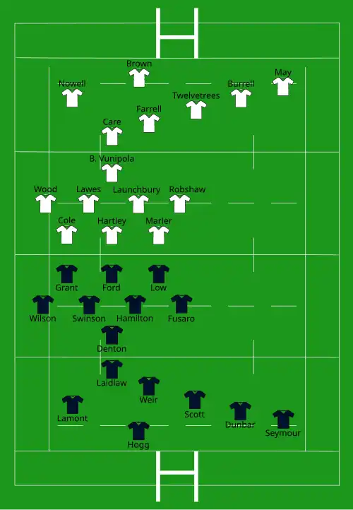 | Try: Hogg 12' c Seymour 22' c Con: Laidlaw (2/2) 13', 22' Pen: Laidlaw (0/1) Weir (1/2) 61' | Report[36] | Try: Huget 45' c Con: Machenaud (1/1) 46' Pen: Machenaud (3/4) 1', 10', 16' Doussain (1/1) 78' |