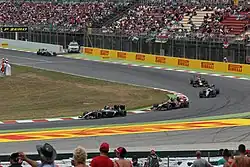 The 66-lap race took place in the afternoon from 14:00 Central European Summer Time (UTC+02:00).[6] Overnight rain made the track damp though it was sunny and warm before the race.[40] The air temperature was between 21 and 23 °C (70 and 73 °F) and the track temperature from 34 to 37 °C (93 to 99 °F);[41][42] conditions were forecast to remain consistent with no rain.[4] 91,480 spectators were in attendance.[43] Autosport theorised that making three-stops would be the optimal strategy but drivers stopping twice would give them better track position.[40] Every driver, bar Vergne, began on the medium compound tyre.[44] Hamilton made a clear start to lead the field entering the first corner.[45] Bottas overtook Ricciardo for third and Rosberg then held him off.[46] Fifth-placed Grosjean locked his front wheels but blocked a pass from Räikkönen at the turn four hairpin.[47] At turn 14, Button put his teammate Magnussen wide into a gravel trap but the latter continued after contact with Vettel.[46] At the end of the first lap, Hamilton led Rosberg by 1.1 seconds with Bottas the same deficit adrift in third.[45]