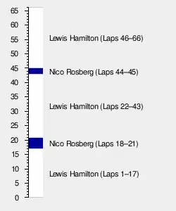 Rosberg lowered the deficit to Hamilton to 1.6 seconds by the time of his teammate's first pit stop at the end of lap 18 for the medium compound tyres and a minor front wing angle adjustment.[45] Ricciardo drew to within 12 seconds of Bottas, and when the latter made his first stop two laps later, Ricciardo moved past Bottas, who rejoined the track narrowly ahead of Grosjean.[40] Rosberg was confused when his engineer Tony Ross called him into the pit lane at the end of lap 21 for the hard compound tyres because he believed he would have a new set of medium compound tyres. He rejoined almost four seconds behind his teammate Hamilton, who was told by radio to increase the gap over the next 20 laps.[47] On lap 24, Räikkönen attempted to pass Grosjean on the right into the first corner for fifth but he ran deep and Grosjean kept the place.[45] He tried again into the same turn on the next lap and passed Grosjean, whose motor–generator unit kinetic partially failed.[47] On lap 25, Vergne retired in the pit lane with a broken exhaust. During the same lap, Grosjean locked his tyres into turn ten and allowed Alonso to challenge him. Alonso used DRS to pass Grosjean on the inside for sixth before turn one on lap 26.[40]