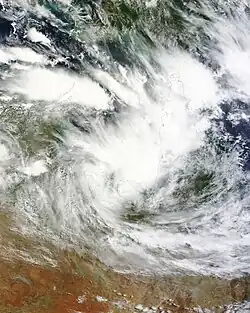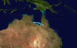 Tropical Low 05U developed over land near Borroloola in the Northern Territory during 21 December.[14][15] Over the next couple of days, the system gradually deepened further as it moved west-northwest inland and passed near Daly Waters and Katherine. The system subsequently approached Darwin during 24 December, where it was causing near gale-force winds offshore. On 26 December, 05U was embedded within a monsoon, giving a potential of intensifying into a tropical cyclone.[16] A couple of days later, 05U drifted southeastwards towards land and failed to reach tropical cyclone intensity.[17] The system was last noted on 2 January while it was located over the Simpson Desert in Queensland, as it was not clear if the low continued towards the east coast or another system had developed.[14]