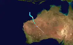 A low-pressure developed east of the 90th meridian east or the border of the basin on 26 December, and had a moderate chance of intensifying into a tropical cyclone.[35] TCWC Perth later classified it as a weak tropical low with the identifier of 06U.[36] On 28 December, as the low slowly moved south, unfavorable environments hinder the chance of being a cyclone.[37] TCWC Perth made its final bulletin of the tropical low as it slowly drifted west on 29 December.[38] During 19 January Tropical Low 07U developed within the monsoon trough of low pressure, about 300 km (185 mi) to the west of West Island in the Cocos (Keeling) Islands.[39] Over the next couple of days, the system moved north-eastwards and tried to develop further in a marginally conducive environment for further development.[40] However, the system weakened on 21 January, before it was last noted on 24 January, as it was not expected to develop into a tropical cyclone.[41][42] During 14 February a weak tropical low lied in an area of marginal conditions for further develop near Christmas Island.[43] Over the next couple of days, environmental conditions surrounding the system became less favorable for further development, before the system was last noted during 16 February.[43][44] During 26 February, Winston entered the basin as an extratropical cyclone, whilst the JTWC classified it as a subtropical cyclone;[45][46][47] ultimately, it made landfall over Queensland as a tropical low and quickly degenerated into a trough, on 3 March.[48][49][50][51]