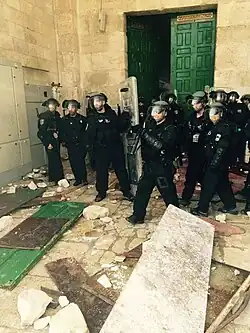 On 13 September, Muslim youths gathered at the al-Aqsa Mosque compound, with the intention of blocking visits by Jews to the area. They clashed with Israeli police who used rubber coated bullets and tear gas, and chained the doors of the mosque shut.[88][89][90] Tensions on the Temple Mount continued for three days, causing damage as Israeli police used tear gas and threw stun grenades toward Palestinian youths barricaded inside the mosque, hurling rocks and flares at police, a Reuters witness said. Israeli Public Security Minister Gilad Erdan, in a statement, said the Palestinians also had pipe bombs.[91][92]