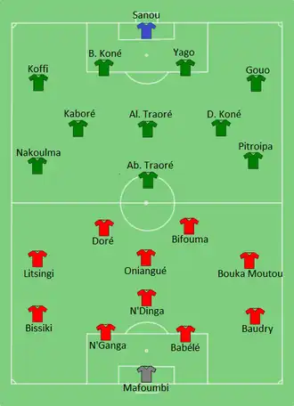 Congo took the lead in the 51st minute, when Férébory Doré crossed for Thievy Bifouma to convert from close range. Burkina Faso equalized in the 86th minute, after Aristide Bancé scored from Issiaka Ouédraogo's cross, but Congo retook the lead one minute later, as from a Congo free kick, Burkina Faso goalkeeper Germain Sanou punched the ball and it hit Fabrice Ondama and went into the net. As a result, Congo qualified as group winners while Burkina Faso were eliminated.[17][18]