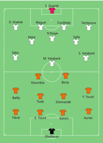 Mali took the lead in the 7th minute, as Bakary Sako scored home from Sambou Yatabaré's cross. Ivory Coast equalized in the 86th minute, when Serge Aurier passed to Max Gradel to score.[11][12]
