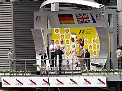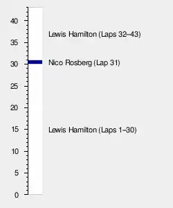 Over the next laps, Rosberg steadily closed on Hamilton in front without being able to catch his teammate. Lap 18 saw Romain Grosjean gain another position at Ricciardo's expense, moving into fourth. Just two laps later he passed Pérez putting in him third place. On lap 21, Daniel Ricciardo's Red Bull came to a sudden stop at the exit of the 'Bus Stop' chicane, leading to a Virtual Safety Car period, during which many drivers made pit stops for new tyres, among them Grosjean, Massa and Verstappen.[47] By lap 29, Kvyat had made a pit stop for new soft tyres, being able to go fast until the end of the race, while Vettel decided to try and finish the race without pitting for new tyres a second time. Kvyat's newer tyres allowed him to overtake Bottas, Räikkönen, Massa and Pérez to eventually finish fourth. Sainz Jr. eventually retired from the race on lap 34.[48] Vettel's strategy however did not work out. By lap 42, less than two laps from the finish, his right rear tyre exploded while on the Kemmel straight, handing Grosjean the final podium position.[49] Vettel ended his race in the pit lane, but was classified down in twelfth place. Unchallenged by his teammate in second, Lewis Hamilton finished the race to take his 39th Grand Prix victory.[48][50]