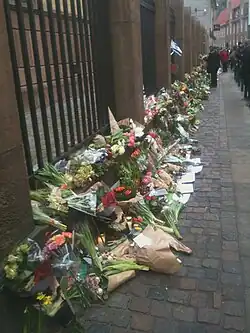 Dagbladet Information published a photo of flowers laid where the killer died.[66] Politiken reported "the perpetrator also gets flowers".[67] The Jyllands-Posten reported that at 16:30 local time the same day, a group of 30 young masked men removed the flowers.[68] The New York Times reported that the group "shouted 'Allahu akbar', or 'God is great', as they removed flowers laid in memorial".[69] The Local of Sweden reported, "One of the men told reporters that they removed the flowers because it is not a Muslim tradition to lay flowers for dead people."[70] A wire from Agence France Presse published by La Dernière Heure of Belgium read, "An elderly woman, who brought flowers but did not wish to be identified, said 'the boy didn't know what he was doing'".[71] The National Post of Canada reported, "'We've put flowers here because we must remember him,' said a young Arab man, who gave his name as Mohammed. 'He was a good guy. We don't believe he did anything wrong.'"[72]