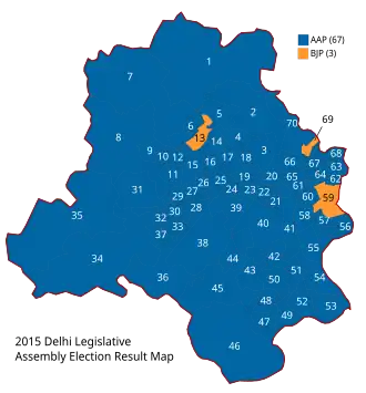 The Delhi Legislative Assembly election was held on 7 February 2015 to elect 70 members of the Sixth Legislative Assembly of Delhi. The results were announced on 10 February 2015. The Aam Aadmi Party secured an absolute majority in the assembly, winning 67 of the 70 seats.[1]