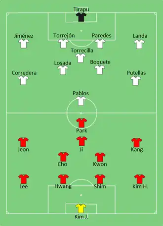 - ^ a b "Tactical Line-up – South Korea-Spain" (PDF). FIFA. 17 June 2015. Archived from the original (PDF) on 18 June 2015. Retrieved 17 June 2015.