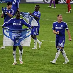 Chelsea were playing in their seventh League Cup final, having won four, most recently in 2007. Their most recent appearance in the final was the first at Wembley, which they lost in 2008 to Tottenham.[3] The game was Chelsea's first domestic cup final since their victory in the 2012 FA Cup final.[5] Incumbent Chelsea manager José Mourinho was in charge in their League Cup wins in 2005 and 2007, and squad members Petr Čech, John Terry and Didier Drogba played in both finals, with the latter scoring in both victories.[6][7] All three also played in the 2008 defeat by Tottenham.[8]