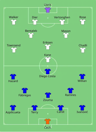 Tottenham's second-choice goalkeeper Michel Vorm had played all of their fixtures on their way to the final, but was dropped to the bench and replaced with Hugo Lloris for the decisive game.[28] Compared to their defeat at Fiorentina, Tottenham made three changes in defence, with only Jan Vertonghen retaining his place – Vlad Chiricheș, Federico Fazio and Ben Davies were replaced by Kyle Walker, Eric Dier and Danny Rose, with Chiricheș not even featuring on the substitutes' bench.[27] Defensive midfielder Benjamin Stambouli and attacking midfielder Erik Lamela were replaced by Ryan Mason and Andros Townsend respectively, with the lone striker position changing from Roberto Soldado to Harry Kane.[27]
