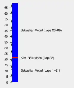 When Lewis Hamilton came into the pit lane on lap 20, he emerged slightly in front of Valtteri Bottas in fifth place. Rosberg made a pit stop for new tyres one lap later, choosing the harder medium compound. The two Ferrari drivers and Daniel Ricciardo followed in the subsequent lap, staying ahead of Rosberg and Hamilton respectively. Meanwhile, Romain Grosjean became the second Lotus driver to be penalised, receiving a five-second penalty for an unsafe release from his pit box.[27] Hamilton was behind Ricciardo in fifth place at this point, who was running the harder compound tyres, eventually passing him on lap 29. By lap 33, Vettel in front was leading teammate Räikkönen by seven seconds, with Rosberg a further twenty seconds adrift. Meanwhile, Hamilton started to gain on his teammate, setting fastest laps to trail him by eight seconds on lap 36.[26]