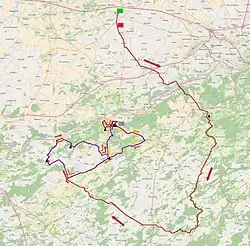 The 205.5-kilometre (127.7-mile) route of the 2015 La Flèche Wallonne began in Waremme, Liège Province, on the Rue de Huy with a 2-kilometre (1.2-mile) neutralised zone.[7] The first part of the route went south-east through Faimes and Saint-Georges-sur-Meuse before reaching the day's first climb, the Côte des 36 Tournants, after 22 kilometres (14 miles). After the climb, the riders continued south-east to Anthisnes; here the route turned south. It passed through Ouffet, then reached Durbuy after 55 kilometres (34 miles). The route then turned west to pass through Havelange before reaching Ohey after 84.5 kilometres (52.5 miles).[8] The roads between the Côte des 36 Tournants and Ohey were not entirely flat, but there were no categorised climbs.[9]