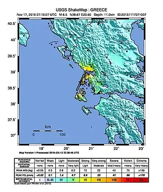 The 2015 Lefkada earthquake occurred on November 17, 2015, 10:40:07 (EEST) with a moment magnitude of 6.5 located 19 km Southwest of the Greek island of Lefkada along with a depth of 11 km and intensities reaching as high as VIII (Severe) on the Modified Mercalli Scale.[2] Two people lost their lives in the event and 4–8 others were hospitalized with injuries.[3][4][1]