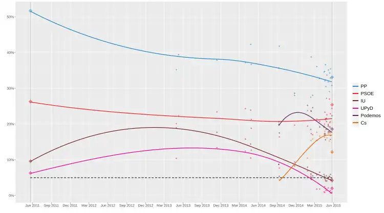 Opinion polls from 2012 predicted a drop in vote support for the PP, to the point that it could lose the absolute majority it had enjoyed almost uninterruptedly since 1995. The same polls had shown that the PSOE remained unable to capitalize on the PP government's electoral wear. On the 2014 European Parliament election, both parties obtained historic lows in the region: with 29.9%, the PP result was its lowest since 1989, while the PSOE's result at 18.9% was the party's lowest score ever. A newly created party, Podemos, was able to poll at 11.3%, placing itself as the third political force of the community and within striking distance of the PSOE.[7] Podemos's growth in opinion polls since mid-to-late 2014 at the expense of the PSOE's vote inspired fears within the party that it could be displaced to third place both regionally and nationally.[8]