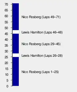 On lap 48, Mercedes changed strategies, bringing in both drivers for another tyre stop, much to the dismay of Lewis Hamilton, who complained to his team over the radio. Meanwhile, a fight developed between Massa and Ricciardo for fifth place, with the latter making the pass at the beginning of lap 53. On the same lap, Sebastian Vettel spun once more at turn seven, this time hitting the barriers, ending his race and bringing out the safety car. The double retirement marked the first time since the 2006 Australian Grand Prix that none of their cars were classified.[21] During the caution period, the order stood as: Rosberg, Hamilton, Kvyat, Bottas, Ricciardo, Massa, Hülkenberg, Pérez, Verstappen and Grosjean. At the restart at the beginning of lap 58, Bottas made a move on Kvyat into turn one, taking third place. Nasr retired on the same lap due to a brake issue. Over the last laps of the race, Hamilton was able to close on Rosberg, as was Massa on the two Red Bull drivers ahead of him. However, neither were able to overtake, and Rosberg crossed the finish line to take victory, followed by Hamilton and Bottas.[19][20]
