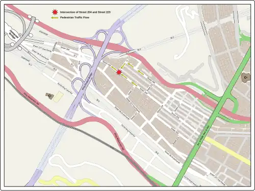 Early statements by eyewitnesses indicated that the crush was caused by the closure of the eastern part of Street 206, which forced pilgrims to travel on Street 223, colliding with a mass of people moving the opposite direction on Street 204.[113]