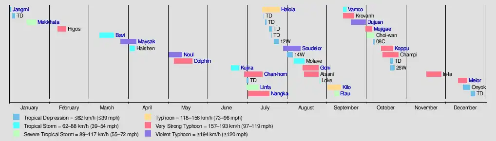 In May, two storms, Typhoons Noul and Dolphin, both reached Category 5 super typhoon intensity.[21] Both typhoons affected landmasses and altogether caused about $37.1 million in damages, respectively. Kujira formed in June and made landfall in southeast Asia, bringing flooding.[22] During the first week of July, the tropics rapidly became active, with a trio typhoons developing simultaneously and affecting three different landmasses. Total damages from Chan-hom, Linfa and Nangka nearly reached US$2 billion. Afterwards, Typhoon Halola entered the basin from the Eastern Pacific.[23] In August, Typhoon Soudelor made landfall in Taiwan and China, where it killed 38 people and damages totaled up to US$3.7 billion[nb 5]. Typhoon Goni badly affected the Philippines, the Ryukyu Islands and Kyushu as an intense typhoon, causing about US$293 million in damages.[24]