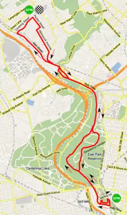 The Philadelphia Cycling Classic followed a six-lap course near the Schuylkill River in northwest Philadelphia. It started and finished at the top of the Manayunk Wall,[4] an 800-metre (2,600 ft) long climb which peaked at a gradient of 17 percent,[5] though it only averaged around 8 percent.[6] The course also included climbs up Lemon Hill and Strawberry Mansion Drive.[4] Each of the six laps was 19.71 kilometres (12.25 miles) in length, giving a total race length of 118.26 kilometres (73.48 miles).[7] "Queen of the Mountain" points were awarded for the first rider to the top of Manayunk Wall and Lemon Hill each lap, while an intermediate sprint was located roughly halfway along the outward section of the lap, where Kelly Drive intersected with Midvale Avenue.[8]