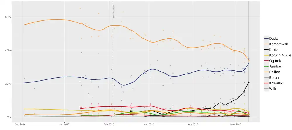 Nearly all opinion polls taken before the first round of the election predicted President Komorowski would receive the largest vote share in the first round, with some polls taken in late 2014 and early 2015 suggesting he was on track for an outright win that would avoid a runoff election.[29][30]