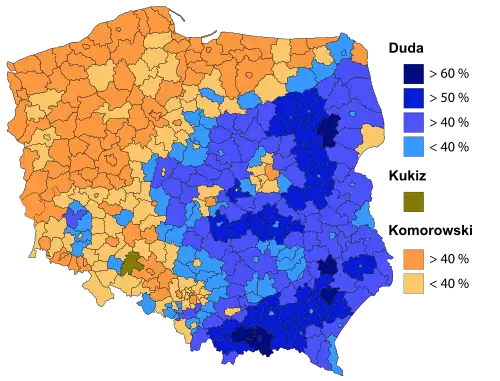 Presidential elections were held in Poland on 10 and 24 May 2015. In the first round of voting Law and Justice (PiS) candidate, lawyer and Member of the European Parliament, Andrzej Duda received the highest number of votes with a share of 34.76%, followed by the incumbent president Bronisław Komorowski (with 33.77%), who ran as an independent with the endorsement of the Civic Platform (PO),[1] whose membership he had renounced after winning the 2010 elections. Independent candidate Paweł Kukiz came in third with 20.80% of the votes. As no candidate had received more than 50% of the votes cast, a second round was held on 24 May between the two highest-placed candidates, Duda and Komorowski. This round was won by Duda with 51.5% of the votes, to Komorowski's 48.5%.