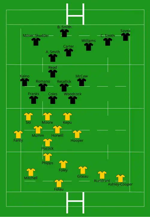 | Try: Kepu 43' c Ashley-Cooper 60' c White 71' c Con: Giteau (2/2) 44', 61' White (1/1) 73' Pen: Giteau (1/2) 26' White (1/1) 68' | Report[10] | Try: Milner-Skudder (2) 55' m, 64' m Pen: Carter (3/3) 8', 29', 50' |