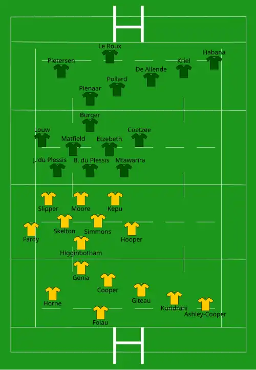 | Try: Ashley-Cooper 32' c Hooper 73' c Kuridrani 80' c Con: Cooper (2/2) 33', 74' Giteau (1/1) 80' Pen: Cooper (1/3) 54' | Report[7] | Try: Etzebeth 37' c Kriel 44' c Con: Pollard (2/2) 39', 45' Pen: Pollard (2/3) 15', 25' |