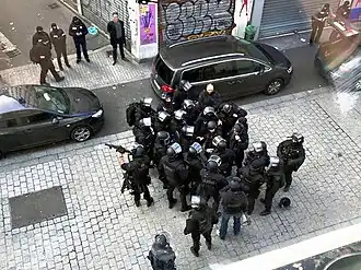 ![]() Heavily armed police gather on Rue de la République, near the scene of the raid. | |