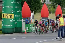 De Gendt took maximum points atop the Kirchberg climb on the riders' first passage. The main field got through the same point 2' 05" in arrears. The descent was fast and the riders crossed the finish line for the first time of three with about 60 kilometres (37.3 miles) to race.[39] The breakaway was caught less than 10 kilometres (6.2 miles) later.[37] Orica–GreenEDGE marshaled the field as De Gendt attacked again to no avail as he was swiftly swept back. Sprint specialists Arnaud Démare (FDJ), Mark Cavendish (Etixx–Quick-Step) and Alexander Kristoff (Team Katusha) struggled with the high pace at the front set by Orica–GreenEDGE.[39][40] As the peloton crossed the line for the last time with 29.2 kilometres (18.1 miles) to race, there were no escapees.[37]