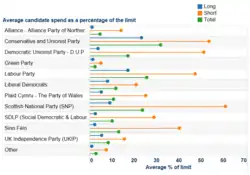 UK General Election 2015 average spending by party candidates as a percentage of spending limit. These figures are based on all candidate spending returns provided to the Commission by Returning Officers by 31 January 2016, being approximately 86.5% of all candidates who stood in the election.
