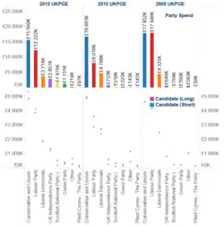UK Parliamentary General Election party and candidate expenditure 2005–15. These figures are based on all candidate spending returns provided to the Commission by Returning Officers by 31 January 2016, being approximately 86.5% of all candidates who stood in the election.