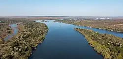 A high broad plateau called the Highveld, part of the Zambezian region, crosses the spine of Zimbabwe at approximately 1,200 meters above sea level.[17] This plateau forms a watershed with lower regions on either side.[18] The surrounding areas slope into the Zambezi River basin to the north, the Limpopo River basin to the south, and the Save River basin to the southeast, making the low-lying regions more prone to flooding.[17][18][19]