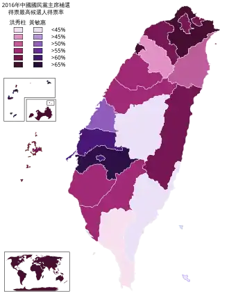 ![]() County level units won by Hung Hsiu-chu. County level units won by Huang Min-hui. | |||||||||||||||||||||||||||||||