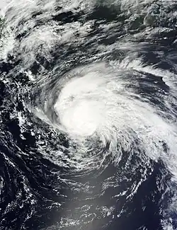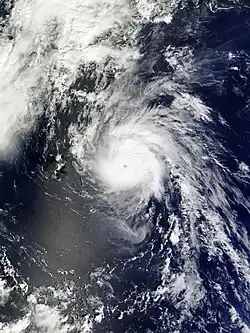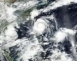 During July 14, a tropical disturbance developed about 400 km (250 mi) to the west-northwest of Guam.[46] At this time atmospheric convection surrounding the system was flaring, over the system's weak but developing low level circulation center.[46] However, as a subtropical ridge of high pressure extended a significant amount of dry air over the disturbance, conditions were assessed to be marginally favorable for further development of the system.[46] Over the next couple of days the system gradually developed further as it moved north-westwards and was classified as a tropical depression by the JMA during July 15.[47][48] After the system had consolidated further, it was classified as Tropical Depression 03W by the JTWC during July 17.[49] However, the system weakened during that day as it moved polewards, along the western edge of the subtropical ridge of high pressure, into an area of increasing vertical wind shear.[49] As a result, the JTWC expected the system to quickly dissipate and issued their final advisory later that day.[50] However, over the next couple of days the system continued to move northwards and impacted the Ryukyu Islands, before it was last noted by the JMA during July 20.[51][52]