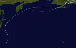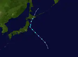 During July 21, a subtropical disturbance developed at the tailend of a mid-latitude trough of low pressure, about 775 km (480 mi) to the east of Iwo-To.[53] Over the next day, deep atmospheric convection developed over the system's elongated low level circulation center, before it was classified as a tropical depression by the JMA during July 22.[53][54] Over the next day, as the storm moved north-northeastwards around a subtropical ridge of high pressure, its structure improved as it developed a warm core and consolidated.[55] The hybrid system was subsequently classified as Tropical Storm 04W by the JTWC during July 23, before the JMA named it Lupit later that day.[54][55] Over the next day, Lupit peaked with sustained winds of 75 km/h (47 mph), as it went through an extratropical transition and took on frontal characteristics.[54][56] Lupit subsequently became extratropical during July 24, before it dissipated during July 26, as it moved into the Sea of Okhotsk.[54]