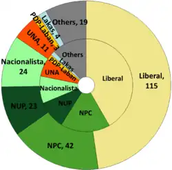 Meanwhile, the Nationalist People's Coalition finished second in number of seats won, followed by the Nacionalista Party, National Unity Party, United Nationalist Alliance, Lakas–CMD, PDP–Laban, Laban ng Demokratikong Pilipino and Aksyon Demokratiko. Several local parties also won seats, along with a handful of independents.