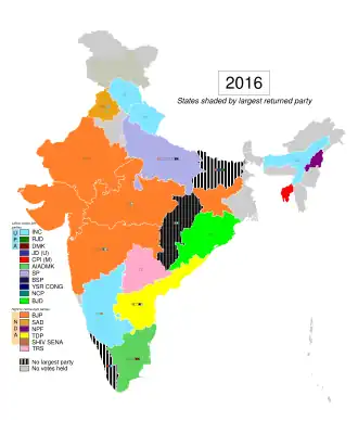 The 2016 Rajya Sabha elections were held as part of a routine six-year cycle among certain of the State Legislatures in India on March 14 and June 11, 2016, to elect 13 and 57 of its 245 members, of which the states through their legislators elect 233, and the remaining 12 are appointed by the President.[1][2] Being even-numbered, 2016 was a year in which about 30% of the State Legislature-elected 233-seat component of the body is elected.