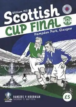 The 2016 Scottish Cup Final was the 131st final of the Scottish Cup and the final of the 2015–16 Scottish Cup, the most prestigious knockout football competition in Scotland. The match took place at Hampden Park on 21 May 2016 and was contested by Scottish Championship teams Rangers and Hibernian.[1] It was the first final to be contested by two teams from outside the top tier of the Scottish football league system.[1] Hibernian ended a run of 114 years from last winning the competition, beating Rangers 3–2 with a stoppage time goal from club captain David Gray.[2]