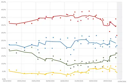 | 21–25 Mar 2016 | Realmeter | 38.3 | 24.9 | 14.0 | 8.5 | 4.0 | 13.4 | ||||||