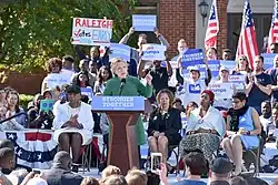 Although Sanders had not formally dropped out of the race, he announced on June 16, that his main goal in the coming months would be to work with Clinton to defeat Trump in the general election.[106] On July 8, appointees from the Clinton campaign, the Sanders campaign, and the Democratic National Committee negotiated a draft of the party's platform.[107] On July 12, Sanders formally endorsed Clinton at a rally in New Hampshire in which he appeared with her.[108] Sanders then went on to headline 39 campaign rallies on behalf of Clinton in 13 key states.[109]