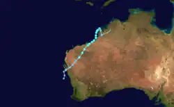 On 3 January, a tropical low had developed to the southwest of Sumatra.[26] On 06:00 UTC of 5 January, TCWC Perth began issuing advisories on the system, using the identifier 08U.[27] TCWC Perth had recorded winds of 75 km/h (45 mph), despite the fact that the system did not have the structure of a tropical cyclone.[27] By the next day, 08U then strengthened into a Category 1 tropical cyclone, with the storm receiving the name Irving, the fourth named storm of the season.[28] Three hours later, the JTWC followed suit and gave the system the designation 04S.[29] TCWC Perth, however, discontinued advisories after Irving exited the basin on 12:00 UTC the same day.[30]