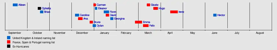 A total of 10 storms affected both the UK and Ireland in that season. Three of these—Ophelia, David and Emma—were named by foreign agencies. Six storms were named by the new co-operation of the meteorological services of France, Spain and Portugal. Two of these—David and Emma—also affected Britain and Ireland significantly.